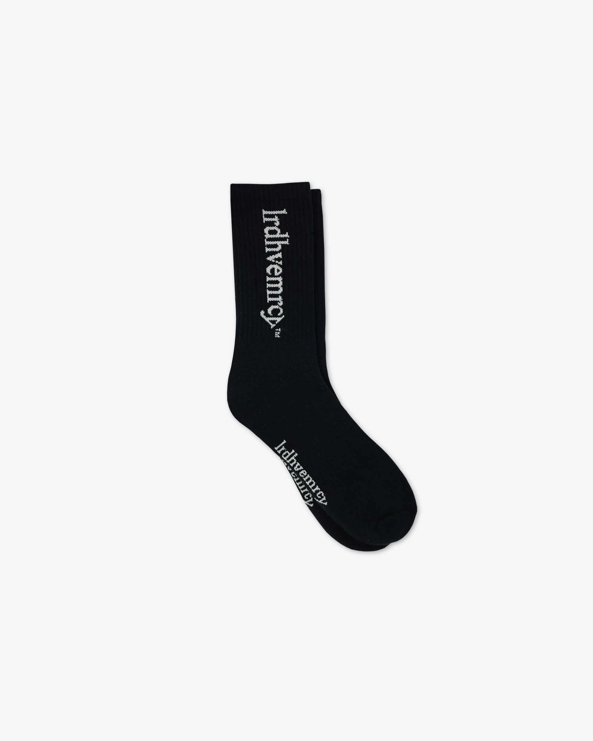 These black and light cream crew socks are made from 100% cotton and feature a large "lrdhvemrcy™" logo. Premium jacquard knit for lasting quality and detail...