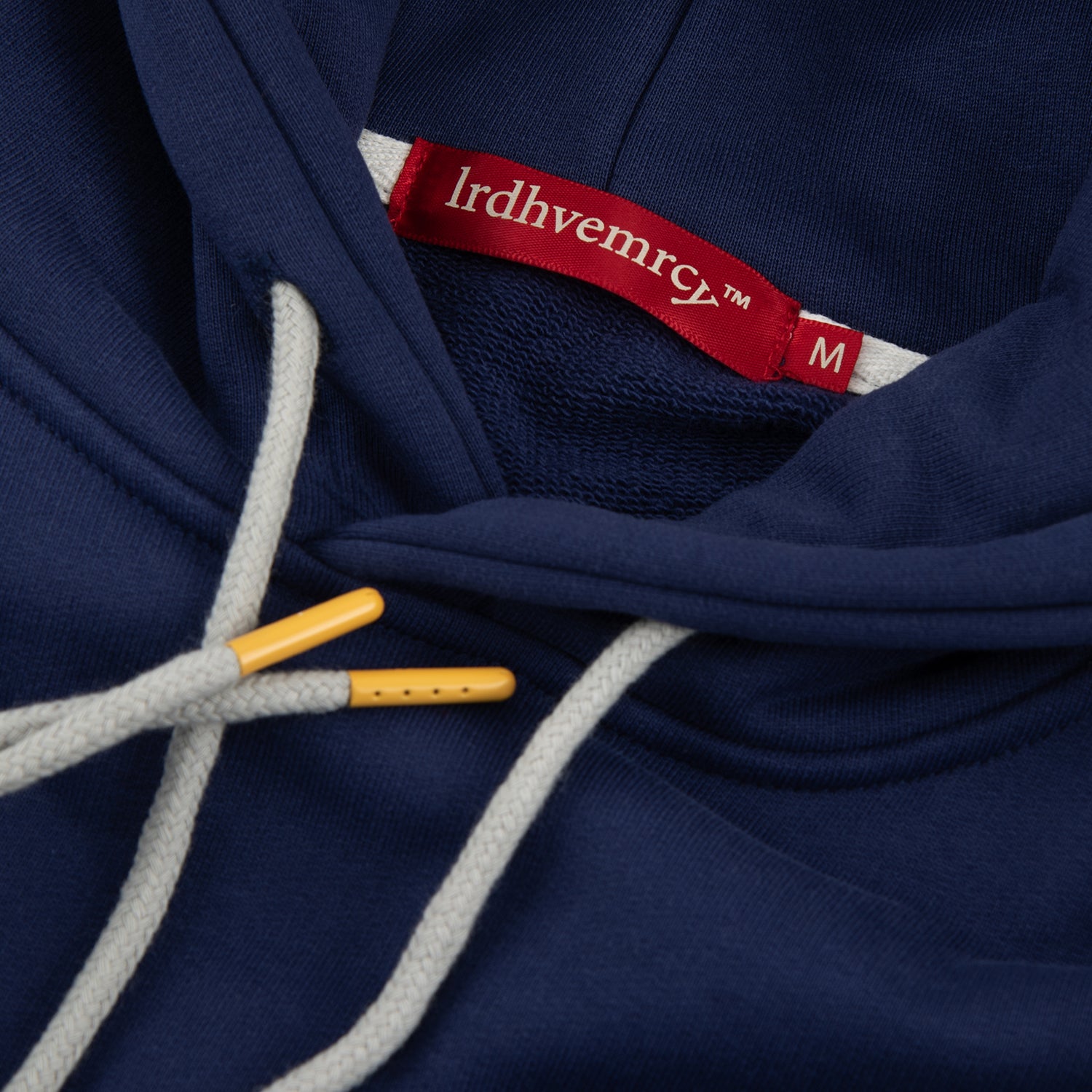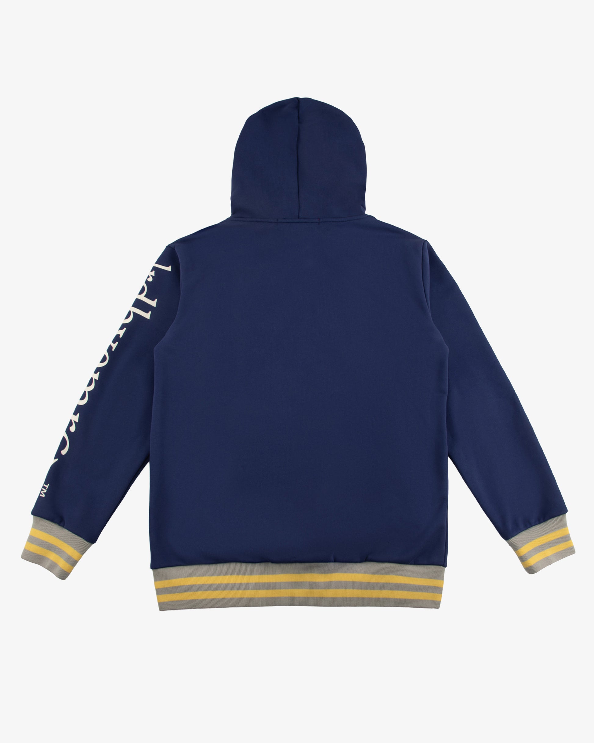 A heavyweight varsity hoodie crafted from 480 GSM loopback cotton, featuring a stitched "lrdhvemrcy™" logo above the front pocket and screen-printed artwork on the sleeve. Navy body with lemon and gray striped ribbed cuffs and hem for a classic varsity look...